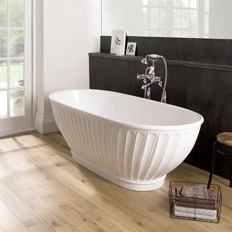 The Casini double ended freestanding bath from BC Designs is stunning with its outside detail and is a fusion of classic and contemporary design. Made from Cian® Solid Surface an advanced blend of acrylic modified polyester resin and mineral compounds, which has heat retaining properties and is scratch and stain resistant.